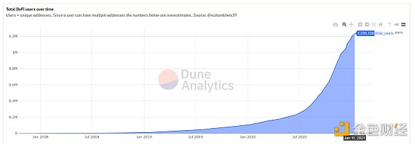 這幅圖是反映當前DeFi項目用戶數的總視圖,可以看到有超過1200萬人在使用DeFi項目,優美的指數曲線,表示用戶處在高增長階段。(注意,這里的“用戶數”采用的是以太坊地址,由于用戶可以有多個地址,因此這個數字被高估了。)