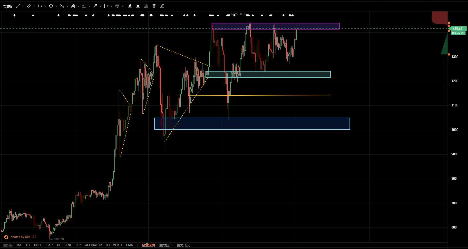 如圖所示,以太坊三探前高壓力區位置,配合ETH/BTC匯率上漲,以太坊有較大概率突破前高;但同時需要注意到,幣安ETH永續合約持倉量已接近8億美元,達到近三個月持倉新高,需要警惕風險;下方短期支撐位關注1400和1360,中期關注圖中青色支撐區1220-1240。