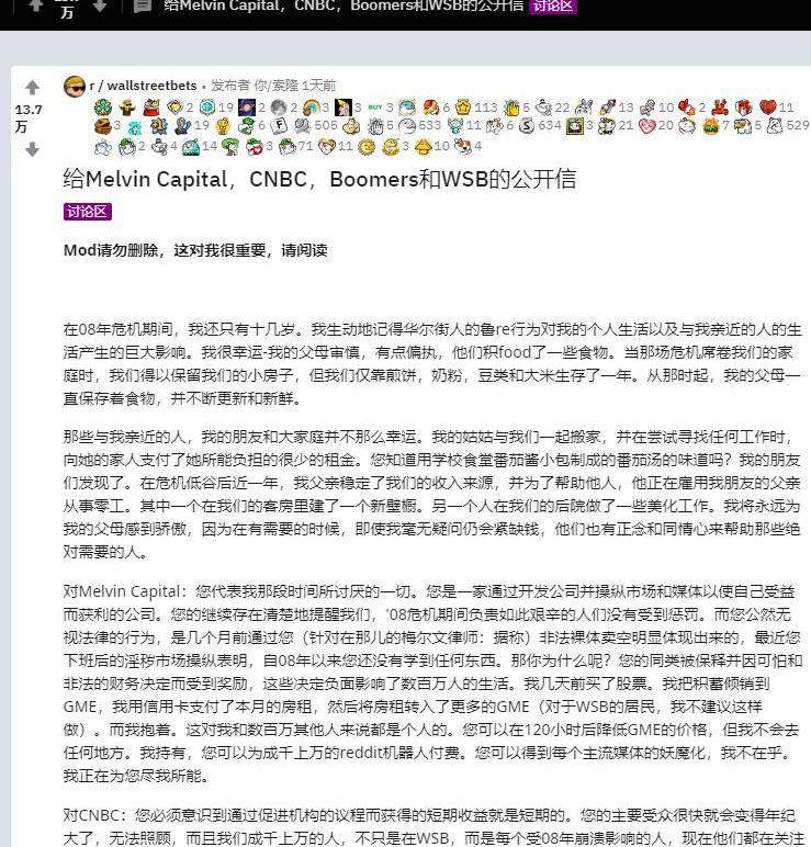 不過緊急調整之后,一封來自WSB論壇用戶的公開信,全網刷屏: