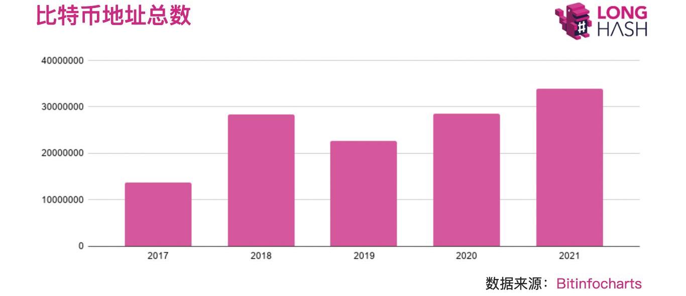大多數比特幣地址在2021年有0到0.001BTC,這與過去幾年的情況相差不大。按照今天的價格,0.001BTC大約是38美元。