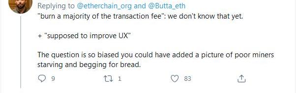 盡管也有人認為EIP-1559將有利于以太坊網絡的安全性和公鏈價值的提升,但該提案無疑將減少現階段礦工的收入。而在Bitfly的EIP-1559推特調查下方,也有不少人表示出對礦工的同情: