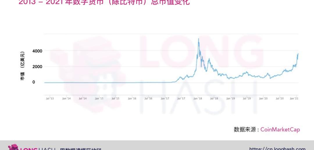 據Coinmarketcap數據顯示,截至1月20日,除比特幣外的數字貨幣總市值約3562億美元,距3年前的歷史高位5390億美元下降33.9%,并未突破3年前的數字貨幣牛市周期的市值高點。