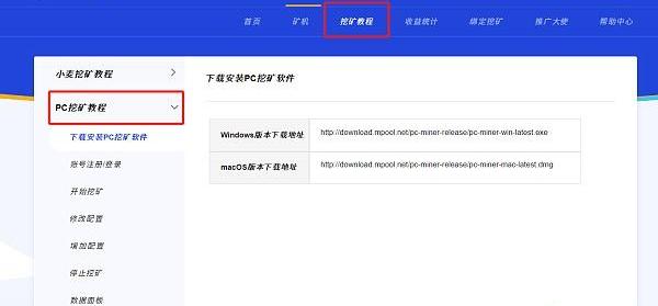 2.依次點擊:挖礦教程——PC挖礦教程——下載安裝PC挖礦軟件,選擇自身電腦對應的系統下載軟件。