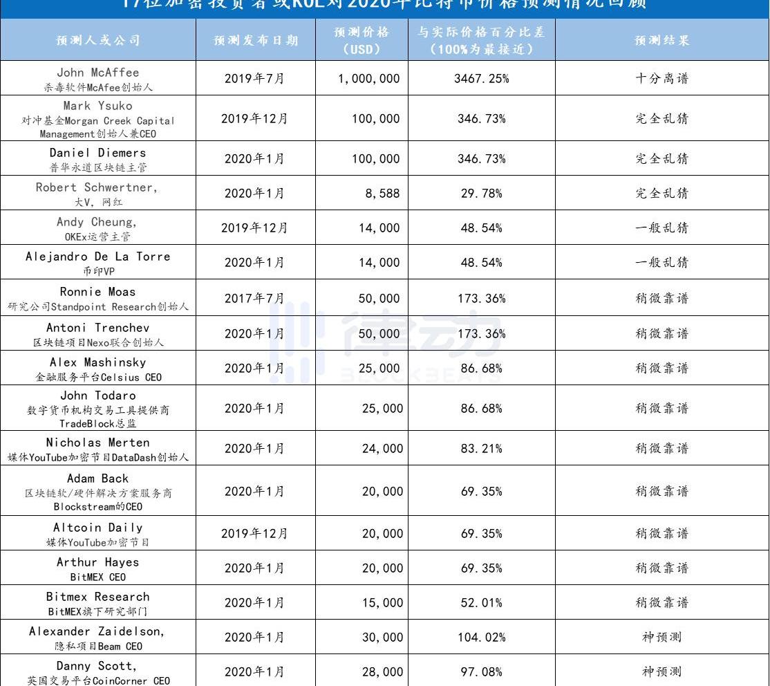 除此之外,其他預測也足夠接近準確的價格,不過考慮到比特幣的波動性,預測比特幣的價格其實是一項艱巨的任務。結果表明大多數對于BTC2019年底或「到2020年」的價格預測幾乎都是錯誤的,「大多數人過于樂觀」。