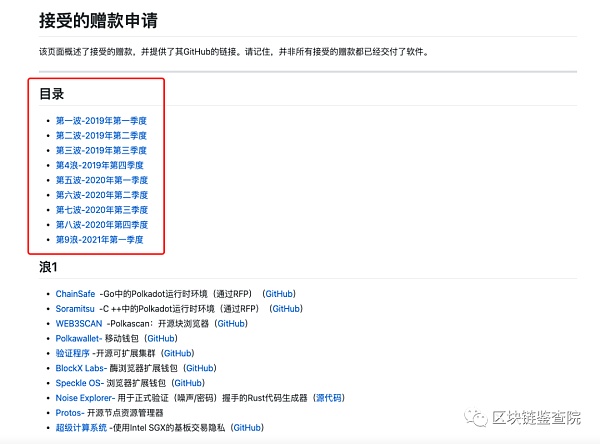 目錄中有基金會每季度扶持項目清單和項目介紹,有些不錯的項目甚至拿過2-3次Grant(研究撥款)。比如,Phala獲得過2次波卡的研究撥款,Zenlink獲得過3次研究撥款。從這里,你就能看出波卡官方對哪些項目更看重。