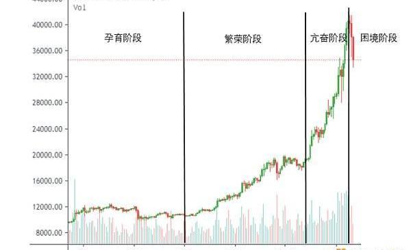 這種瘋狂的上漲反映出:比特幣市場,投機已經成了主導因素,市場過于狂熱。可以明確的是,比特幣市場已經處于泡沫周期的亢奮階段,隨后即將進入困境階段,比特幣市場將迎來暴跌---這正是我們現在所看到的,比特幣價格由4萬美元跌至當前的3.3萬美元。
