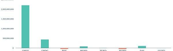 其中,主要的增長來自Tether。Tether累計增發18.50億,具體為以太坊10.00億,波場8.50億。USDC的流通量增加9.40億,于2020年12月31日達到40億美元,其中以太坊上39.13億,其余則是在Solana和Algorand上。需要特別強調的是,包括福布斯在內的絕大多數媒體都只統計了以太坊上的數據,這是不準確的。其余穩定幣市值變化不大。