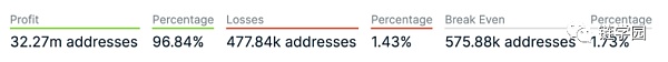 其中,96.92%的地址處于盈利狀態,僅有1.39%的地址處于虧損狀態,1.69%的地址處于盈虧平衡狀態(數據截至2021年1月1日)。