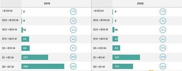 與2019年相比,2020年融資交易規模分布相對穩定,有兩筆交易金額在1億美元左右。今年變化最大的投資規模組是0<100萬美元和100萬<500萬美元(見圖29)。這表明較大的交易規模中值有所上升。