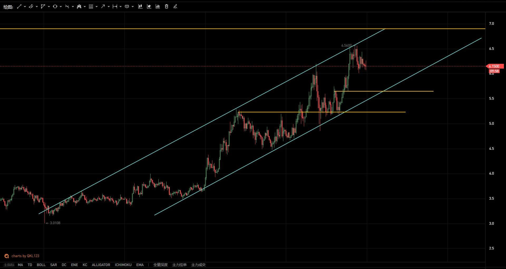 如圖所示,UNI處于4H級別上漲通道中,但通道內不確定性較大,不適合較大杠桿操作。目前來看,UNI有回調的傾向,下方短期支撐關注5.65和5.2附近,中期關注4.8位置的支撐力度。
