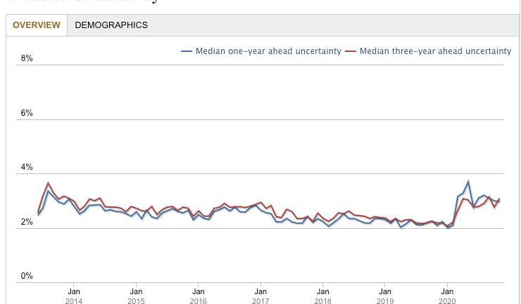 雖然通脹率仍在2%左右,但未來潛在通脹的不確定性增加。換句話說,雖然目前對預期通脹率的估計中值仍固定在2%左右,但預期的差異已經擴大。這一點反映在下圖中,來自紐約聯儲的數據顯示,2020年3月之后,通脹的不確定性增加到3%以上。