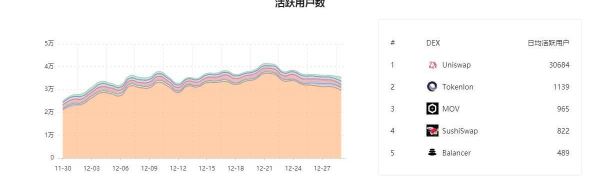 作為DEX的領導者,Uniswap成為用戶首選的去中心化交易所。根據qkl123數據顯示,Uniswap人均活躍用戶遠遠超過其他DEX,以日均3W+的成績位居第一。