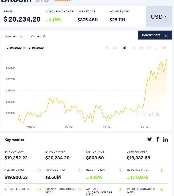 繼突破歷史最高值后,比特幣攻破20000美元大關,再創歷史新高。12月16日晚間,比特幣首次站上20000美元。根據比特幣新聞資訊網Coindesk價格,截至發稿,比特幣價格約為20234美元,24小時內漲幅達4.16%,24小時內比特幣成交額為251.1億美元,市值為3754.8億美元。