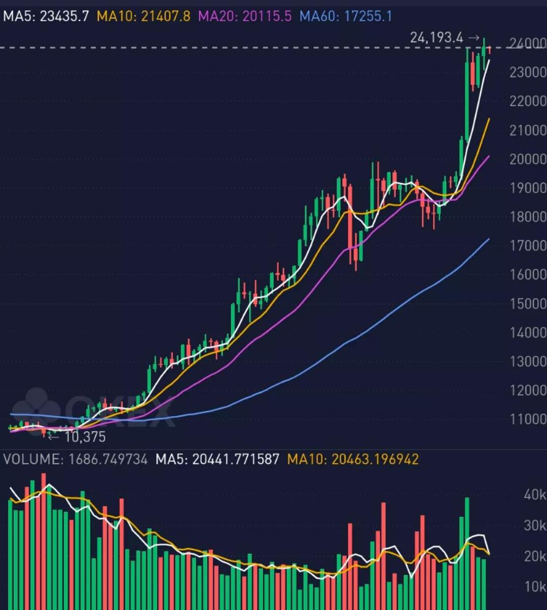 12月21日凌晨,在強勁的資金推動下,比特幣價格達24000美元,這意味著比特幣僅僅用了三天時間,就再度上漲了20%,從20000美元拉升到24000美元附近。