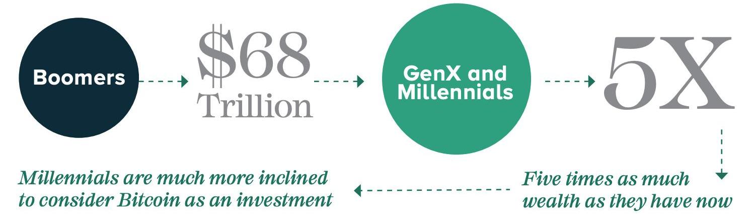 相較于女性投資者,更多男性會敢于嘗試投資比特幣,而年輕人比年長的人也更愿意投資比特幣。雖然老年投資者,目前比年輕投資者持有更多的財富,但年輕投資者將從老一輩繼承大量的財富,因此在未來幾十年內,68萬億美元將從40后傳給60后,甚至到千禧一代。當到2030年時,千禧一代的投資規模將是現在的五倍。