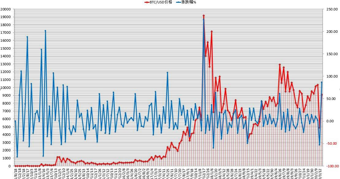 圖2如圖2所示是2017年4月16日收盤價創歷史新高以來至今年5月6日的比特幣重大價格運動走勢圖表。這個階段價格運動與2013年之前以及2013年至2017年4月16日階段對比,呈現價格運動越來越頻繁趨勢。在此階段的80次重大運動中,有64次運動持續時間在20日以下,占比80.0%。在剩余的16次價格運動中,持續周期超過30日以上的僅有8次。這再一次反應了比特幣具有波動頻繁周期性短的投機特征。在持續20日以上的重大運動中,重大上漲運動分別發生在2017年4月16日—2017年5月25日,漲幅108.21%;2017年9月27日—2017年11月8日,累計漲幅67.71%;2017年11月12日—2017年12月17日,漲幅226.42%;2018年3月30日—2018年5月5日,累計漲幅39.65%;2018年6月28—2018年7月24,累計漲幅39.95%;2018年8月10日—2018年9月10日,累計漲幅19.1%;2019年4月25日—5月15日,累計漲幅55.32%;2019年6月4日—2019年6月26日,累計漲幅65.72%;2020年3月12日至2020年5月6日,累計漲幅86.31%。在持續20日以上的重大運動中,重大下跌運動分別發生在2018年1月6日—2018年2月5日,累計跌幅-59.92%;2018年3月5日—2018年3月30日,跌幅-40.01%;2018年5月5日—2018年6月28日,累計跌幅-46.01%;2018年11月13日—2018年12月15日,跌幅-49.22%。2019年7月9日—2019年7月29日,跌幅-24.44%;2019年8月8日—2019年8月29日,跌幅-20.81%;2019年9月3日—2019年10月23日,累計跌幅-32.87%;2019年11月7日—2019年11月24日,跌幅-24.9%。2020年2月15日至2020年5月6日,累計跌幅-52.85%。上述統計數據詳見文末原始數據附圖。總之持續時間多于20日或者30日的價格運動,最可能繼續發展成為重大的價格運動。重大的價格運動也往往持續20日或者30日以上。而那些少于20日或者30日的價格上漲和下跌運動,往往被新的反向運動打斷,例如2019年6月26日以后的屢次反彈,被新的下降趨勢打斷。波動率如下圖3所示,通過歷次的重要漲跌數據,計算出的漲跌幅度隨著時間變化,反應了比特幣歷年的波動情況。在2014年1月6日之前,比特幣的波動幅度非常大,歷史上最高的兩次波動分別出現在2013年4月10日漲幅1595.5%和2013年11月30日的漲幅752.3%,為了圖表美觀,這兩個峰值數據在圖表中縮小10倍顯示,見圖表中紅色箭頭指示,第三次峰值出現在2017年12月17日的漲幅226.42%。2014年1月6日以后,比特幣的重大價格運動的漲跌幅度幾乎在-50%~50%范圍內,隨著市值的增加,波動范圍明顯收窄。50%漲跌幅度對于合約交易非常有借鑒意義,將杠桿控制在2倍以內,是及其安全的,極端情況下才可能爆倉。