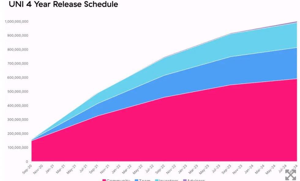 第一年將有3.5億UNI分配給社區基金、團隊、投資者和顧問。在第二年,這一數字將達到2.5億,然后在第三年達到1.5億,最后在第四年達到1億。