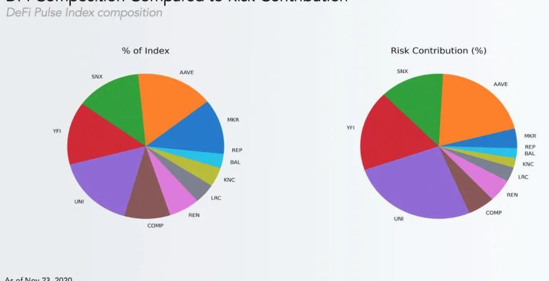 此外,DPI總風險的77%主要由4種代幣驅動,DPI指數的收益會由于這4種代幣的價格波動而變得極為敏感。與我們的60/40投資組合一樣,DeFiPulseIndex組合中的少量資產帶來了大量風險。