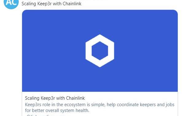 12月2日,Andre宣布將使用預言機項目Chainlink來擴展Keep3r網絡,這意味Keep3r節點將可升級為Chainlink的節點,以提升安全性能。之后,Chainlink節點將也能夠開始運行越來越多的Keeper工作,最終形成一個通過Keeper實現高安全性能、通過Chainlink實現可靠性和抗Sybil攻擊的網絡。