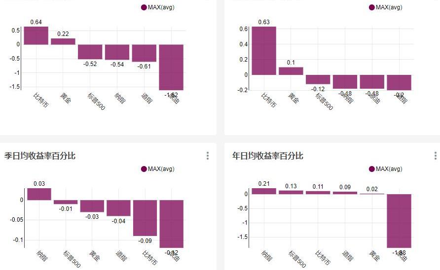 2.從圖中可以看出,近期由于受到市場避險情緒影響,在近1周和近1月,比特幣的日均收益率顯著高于其他資產品種。但是從長期看近1季和近1年,納指的日均收益率更高。