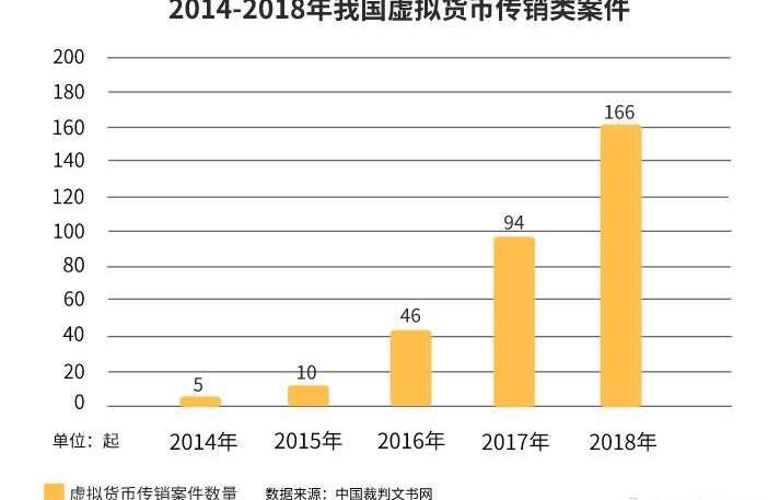 據中國裁判文書網統計,2018年,我國虛擬貨幣的傳銷類案件多達166起,2017年為94起;2016年為46起;2015年為10起;2014僅有5起,而近幾年的案件年均增長率超過100%。