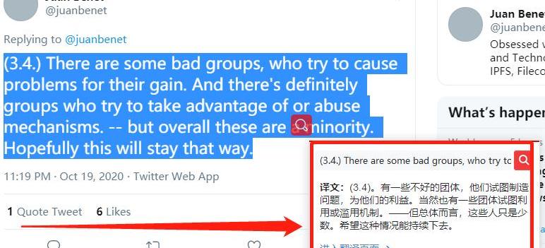 20日,胡安的推特一連發了40多條推特,其中一條就提到:有一些不好的團體,他們試圖為了利益制造麻煩。也有一些團體試圖利用或濫用機制。但總體而言,這些人只是少數。
