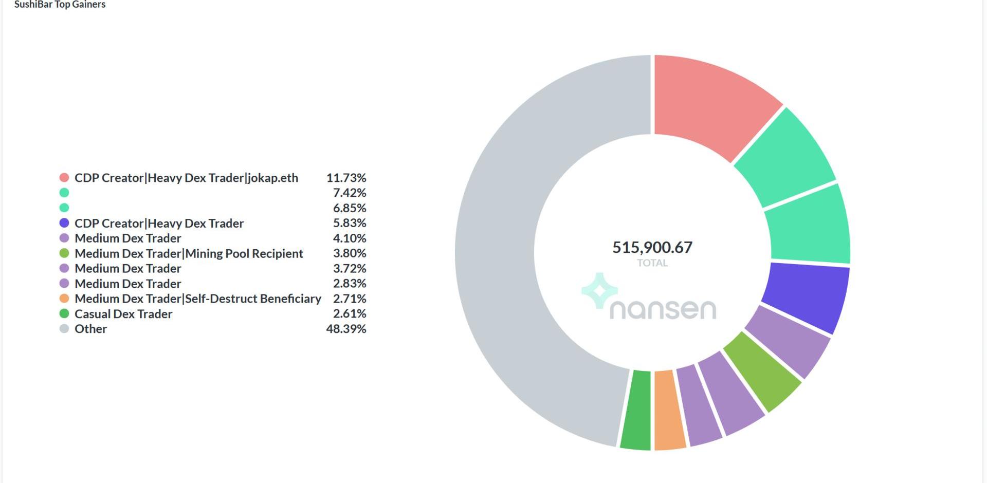 為了確定這一點,我們可以再次利用Nansen的標簽。為了更全面的了解,我們可以嘗試將所有的標簽歸類到一起,試圖了解大部分的SUSHI代幣都去了哪里。