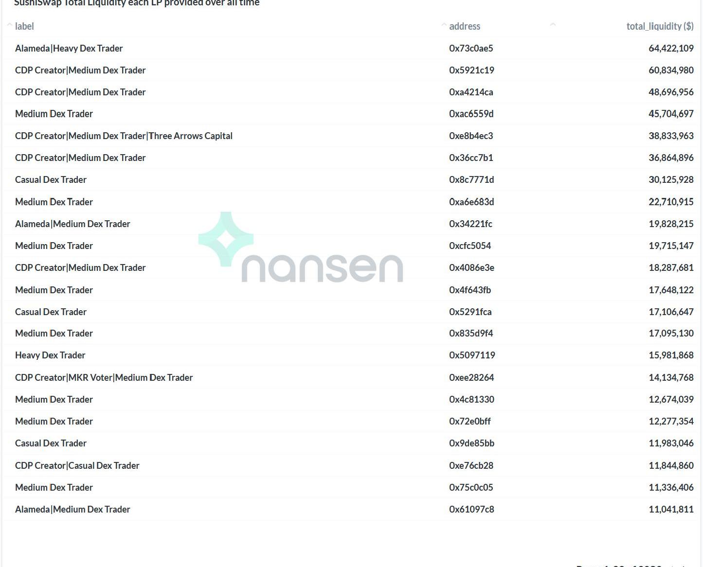 從下圖中我們可以看到,最引人注目的標簽是Alameda和ThreeArrowsCapital,它們都提供了超過3500萬美元的流動性。請注意,這不是我們在上一節中提到的來自Alameda的那一個SBFMultiSigner地址。這可能意味著Alameda似乎使用多個錢包與SushiSwap交互。