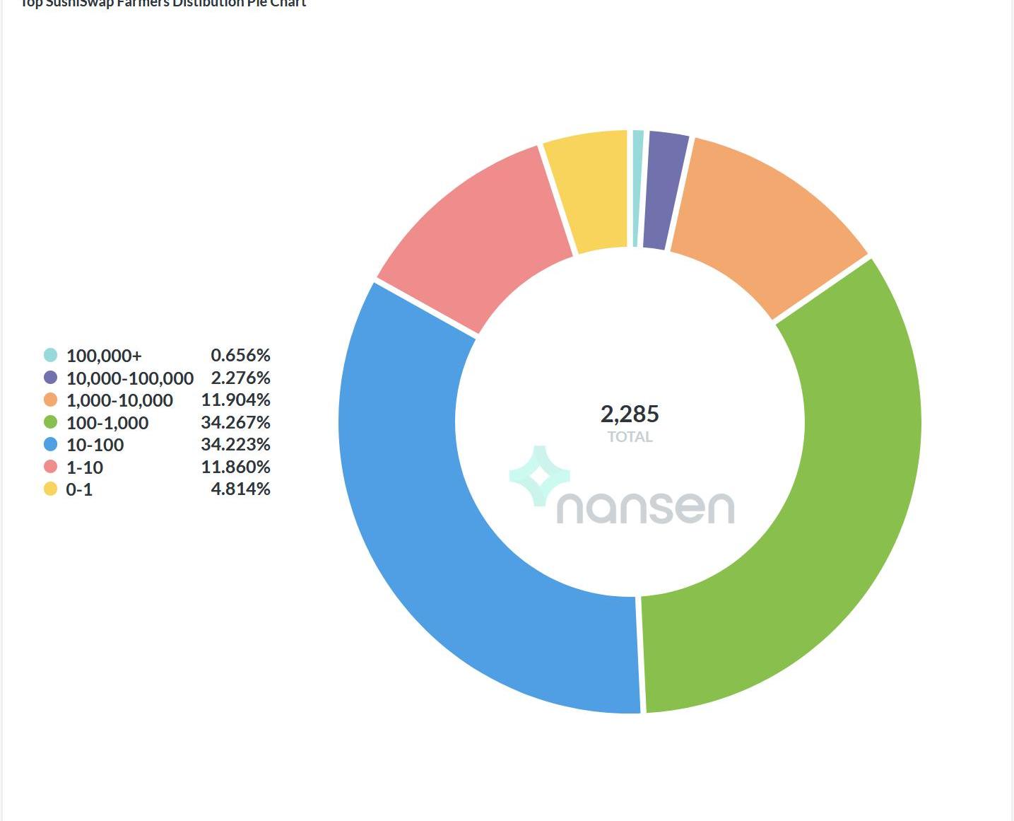 約11.9%的地址挖到過1,000至10,000枚SUSHI。只有少數(2.9%)挖到了超過10000枚SUSHI。大部分(68.5%)曾挖到10至1000枚SUSHI。