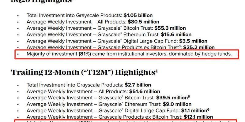 在所有的投資者構成中,機構投資者的占比無疑是最大的。2020年三季度,流入灰度所有信托與基金產品的資金量為10.5億美元,其中81%的資金來自機構投資者,過去12個月流入灰度的27億美元的總資金量中,也有80%的資金來自機構投資人。按照灰度披露的信息,機構投資者流入灰度產品的資金量,對沖基金占據了主要部分。雖然沒有具體披露對沖基金流入灰度產品的具體資金數據,但考慮到對沖基金在灰度機構投資者中占據大部分比例,且機構投資者的資金流入量占比高達80%以上,對沖基金對灰度產品的貢獻應該不小。