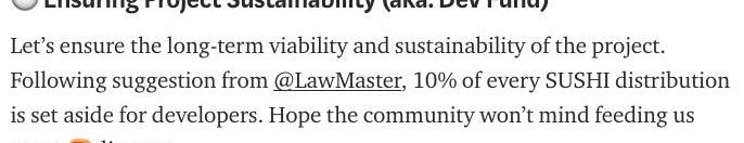 最早在Medium上宣布推出“壽司”Sushiswap項目的文章現在已經刪除,從存檔網頁中我們發現Nomi大廚提到了Sushiswap有一個項目可持續/開發基金: