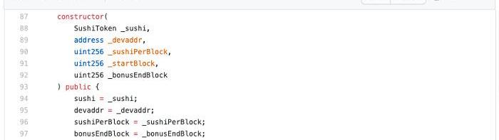 簡單地說,這些參數都與源代碼相匹配,因此我們可以獲得devaddr的參數,結果會發現這個地址已經被明確地設置為Nomi大廚的地址,下圖是GitHub上的Masterchef.sol構造函數變量: