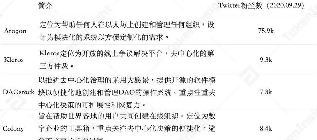 但同時,在TheDAO事件之后,業內也不斷有諸如Aragon、DAOstack、Colony、Kleros等DAO項目被發起。這類項目普遍搭建于以太坊之上,定位于提供DAO基礎設施和建設工具,隨著DeFi治理通證的發行而迎來應用需求的增長。