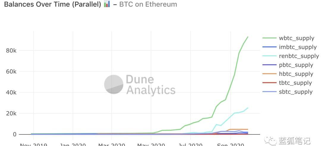 當前以太坊上流通的BTC的總量超過12.7萬個,占據BTC總量的0.608%,價值超過13億美元,其中wBTC占據了絕大多數的市場份額,目前超過70%。