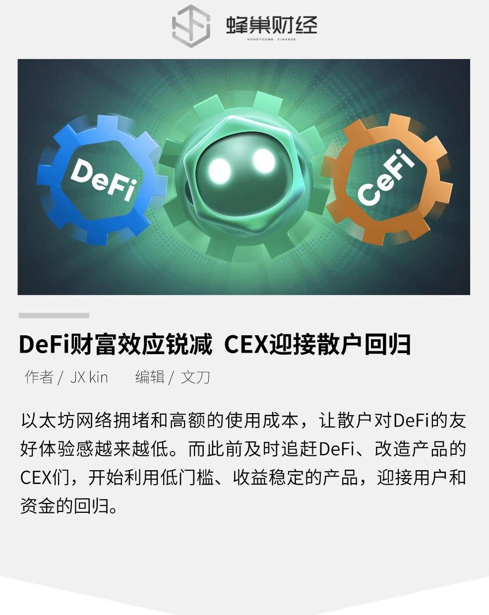 手續費的這「一增」和DeFi挖礦收益這「一減」,讓用戶參與DeFi需要的資金成本越來越高,對小資金散戶的友好度降低。此時,CEX們此前布局的DeFi改造產品迎來的機會。