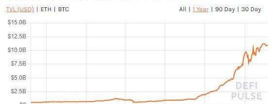 根據DeFiPulse的數據,所有DeFi平臺鎖定的總價值接近其歷史最高水平,徘徊在110億美元左右。