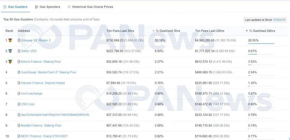 DeFi市場的火熱也并非只有好處,以太坊上的礦工費已經超過比特幣,并創下新高。以前一筆普通的轉賬只要不到1美元,現在可能需要20美元。網絡擁堵使以太坊的用戶體驗大大降低。而這些也都和流動性挖礦有關。從Etherscan的數據可以看到,過去24小時使用gas費最多的地址中,有4個為流動性挖礦協議的合約地址。另外,因為流動性挖礦使用的代幣已經由單純的穩定幣、以太坊等轉向了LP代幣,Uniswap作為重要的LP代幣提供者,Gas費大增。