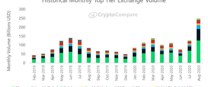 CryptoCompare在報告中稱,根據我們嚴格的交易所基準方法選出的頂級交易所在8月份的總體交易量較7月份增加了58.3%。