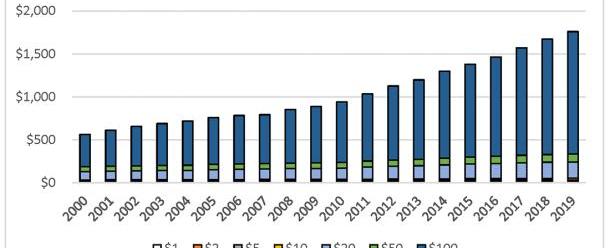 鈔票是央行貨幣中最明顯的形式,因為它們為公眾廣泛使用。美聯儲鈔票是美國的官方貨幣,于1914年隨著美聯儲的建立而首次發行。截至2020年3月31日,約有1.8萬億美元的美聯儲鈔票在流通。根據一項經濟研究,約有一半的美國流通貨幣在國外持有。與流行的“現金死亡”報告相反,即使支付交易的現金使用量可能下降,最終用戶仍會持有美聯儲鈔票。表1顯示了過去二十年來流通中的美聯儲鈔票的價值增長。