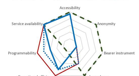 為了進行本文中的比較,對支付機制的測量主要分為以下七類:可訪問性,匿名性,不記名票據,獨立性,運營效率,可編程性和服務可用性。這些類別并非詳盡無遺,而是側重于具有更大潛力的領域差異。在某些情況下,類別之間可能存在很強的相關性。例如,由不記名票據可能具有更強的“獨立性”,因為需要的中間人更少。不考慮其他重要類別,因為它們代表已知的差異,或因為技術在立法、監管或政策解決方案中起著次要作用。