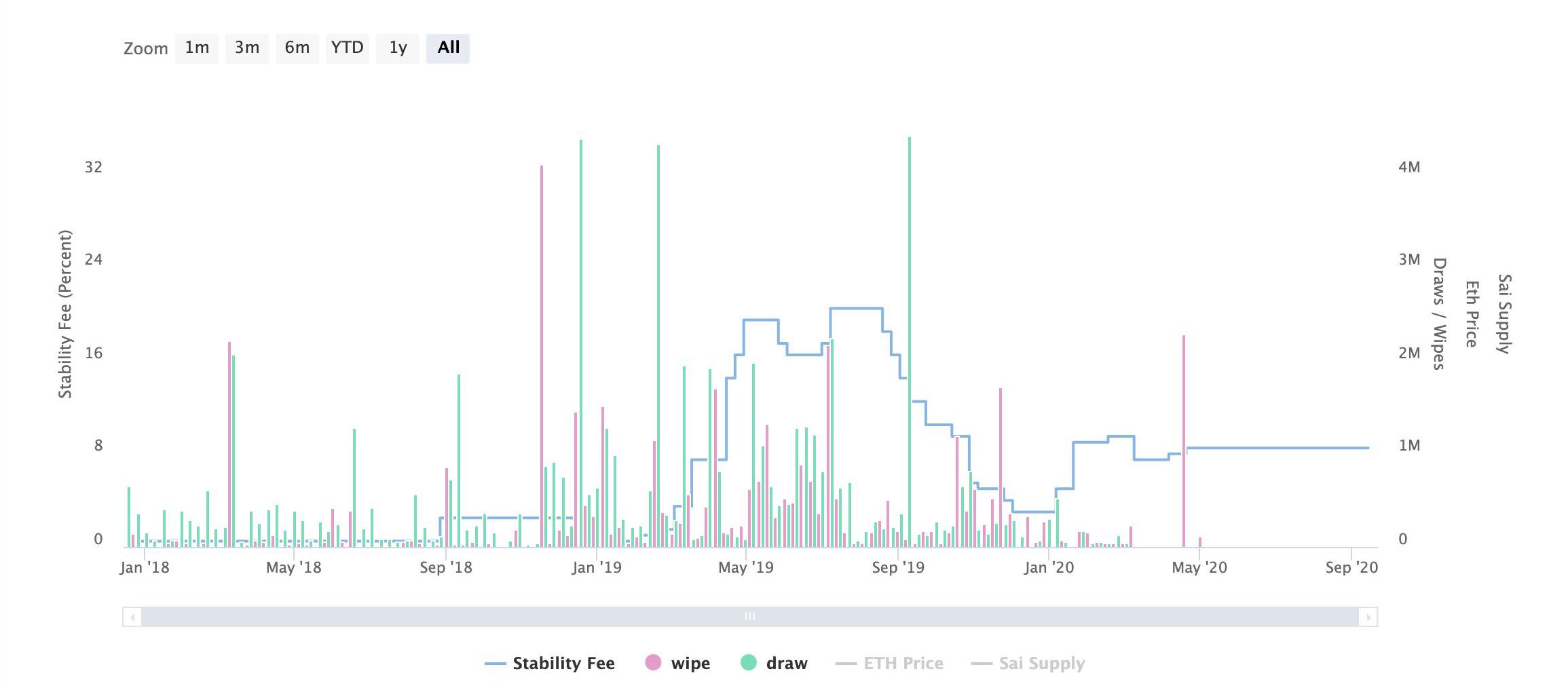 任何未償付的DAI資產抵押債券都要繳納穩定費,理論上應相當于DAI資產抵押債券市場的最高利率。這個速率是由社區(即MKR代幣持有者)設置的。MKR是MakerDAO項目的治理代幣。穩定費一直在0%和20%之間劇烈波動。