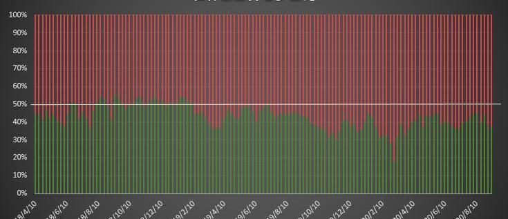 散戶持倉方面,多頭頭寸自2815張進一步下降至2724張,空頭頭寸自439張小幅反彈至514張。與大戶的調倉方向一致,散戶在行情出現劇烈下跌過后又一次進行了追隨市場方向的凈空調倉,不過最新統計周期內這類賬戶多空雙向的調倉幅度都非常有限,這在一定程度上表現出了散戶在單邊快速行情出現時相對迷茫的狀況,因為在第一時間沒有充足的時間進行調整,在劇烈單邊行情走出后散戶的后續調倉會更加猶豫。