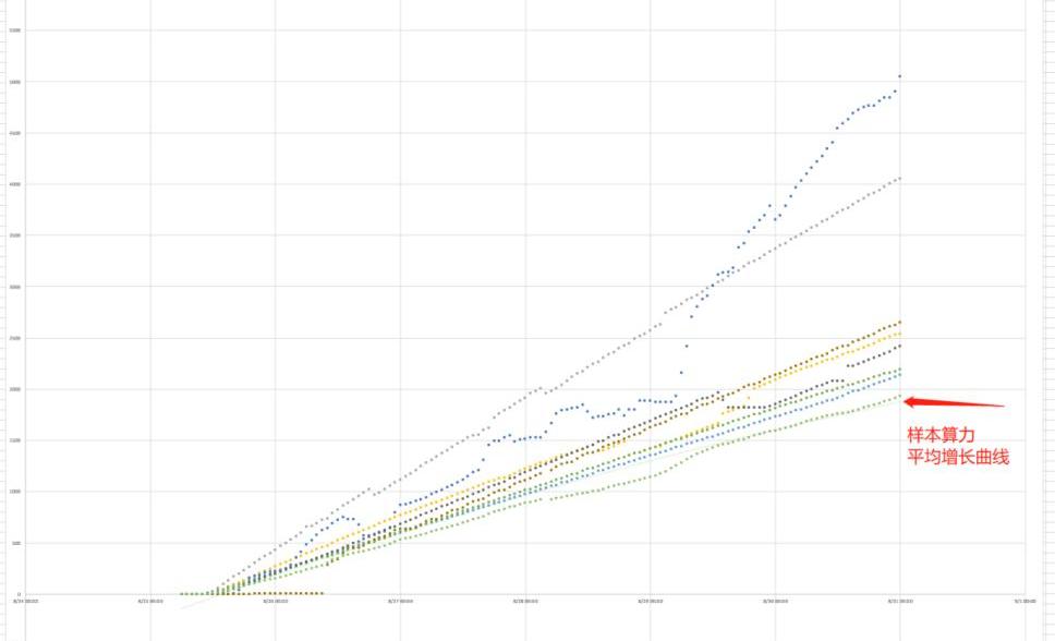 我們把增長平均值曲線撥離出來發現,8月29日即上周六,算力出現小量增長下沉。
