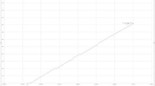 根據對數、對冪、多項式、線性回歸等回歸擬合綜合評估,線性回歸擬合程度最高推演公式為y=5957.3*T-792.93,雖然整個網絡單節點算力增長規律難尋,但根據此公式推導,當網絡正常運行到14天,頭部樣本礦工總算力可達81.4687P。