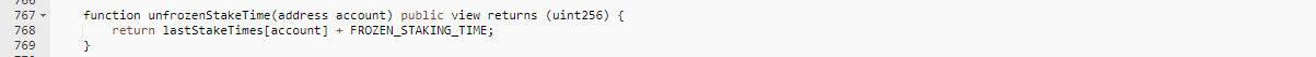此函數中的lastStakeTimes=block.timestamp;語句會更新用戶地址映射的laseStakeTimes。而用戶取出抵押所用的函數中又存在驗證,要求用戶取出時間必須大于lastStakeTimes+72小時。如下圖所示: