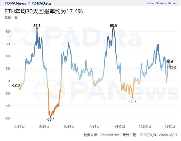 在單邊上行的趨勢下,2020年ETH持幣30天的年平均回報率約為17.4%,最高達到85.9%。