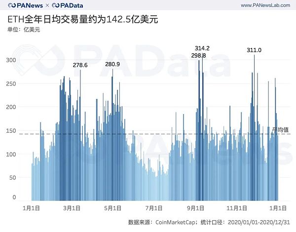 根據統計,ETH全年日均交易量約為142.5億美元,其中,9月10日創下了年內最高單日交易量,約為314.2億美元,7月3日創下了年內最低交易量,約為51.09億美元。另外,全年單日交易量超過200億美元的天數有54天。