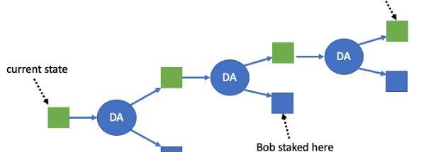 協議的另一個重要部分是staking。任何人都可以放一個stake在樹上的一個方格上。通過在一個方格上staking,你是在斷言這個方格最終會被協議所確認。換句話說,你是在斷言你已經在從當前狀態到你所staking的方格的路徑上的每一個DA采取了正確的分支。如果你錯了,你可以預期失去你的stake資產。