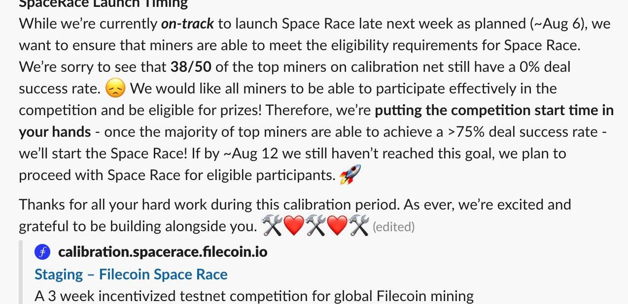 7月31日,Filecoin官方發布消息,稱雖然測試網獎勵計劃可能會有所推遲,原因是希望有更多具備實力的礦工能夠達到相應的標準,即多數大礦工都能實現超過75%的交易成功率。但是,如果多數大礦工沒能達到上述標準,官方依然將于8月12日為有資格的礦工開啟測試網獎勵計劃。