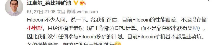 “Filecoin不少人問,說一下。經我們評估,目前Filecoin的性能很差,不足以存儲小電影,且經濟模型錯誤,因此我們沒有任何參與Filecoin挖礦的計劃。目前Filecoin礦機基本都是韭菜坑,各位謹慎參與,想挖礦的自己攢機就行。”